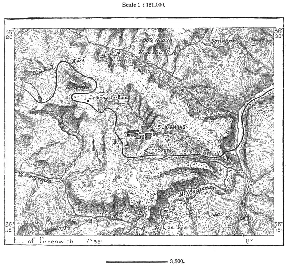 region was covered with olive groves, as is evident from the oil-presses, remains of which occur in every Roman farmstead. Suk-Ahras, the chief place on the frontier plateau, occupies the site of the ancient Thagaste, the birthplace of the famous Austin, bishop of Hippo. Until 1852 a mere military station threatened by the powerful Hanensha tribe, Suk-Ahras has since become a flourishing town, as the chief centre of trade and intercourse between the two ports of Bona and Tunis. Here large tracts have already been brought under cultivation, and the slopes of the hills, recently overgrown with scrub, are now under crops or planted with vineyards. Of Roman antiquities