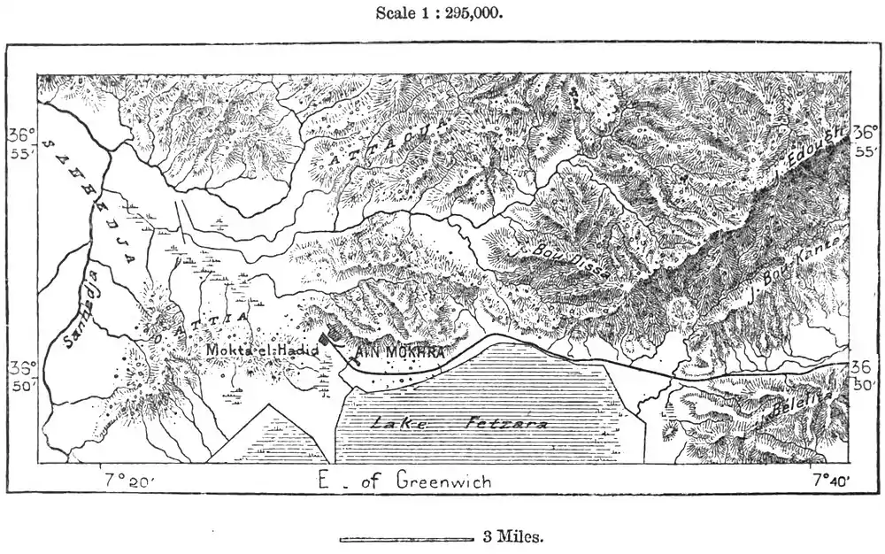 somewhat neglected. From the crest of this eminence an extensive view is commanded of the surrounding hills falling northwards in terraces down to the coast, and in the opposite direction down to the depression of Lake Fetzara. On the northern slope, between Capes Garde and De Fer, the only group of habitations is the little fishing village of Herbillon (Takush); but the southern is more thickly inhabited, thanks to the iron-mines of Mokta-el-Iadid, which yield an excellent ore, almost as highly appreciated as that of Dalecarlia, and containing 62 per cent. of pure metal. Over a thousand workmen are employed in these mines, which yield about four hundred thousand tons annually, valued at £280,000, and exported to France, England, and even the New World. But the rich deposits of copper and zine found at Ain-Barbar, in the very heart of the Edugh district, are no longer worked, owing to the extreme difficulty of cartage.
