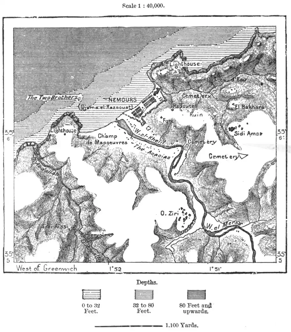 The European settlement of Remchi, conveniently situated below the confluence of the Isser and Tafna, forms the chief station between Tlemcen and its natural outport, Beni-Saf, which, notwithstanding a badly protected harbour, does an active