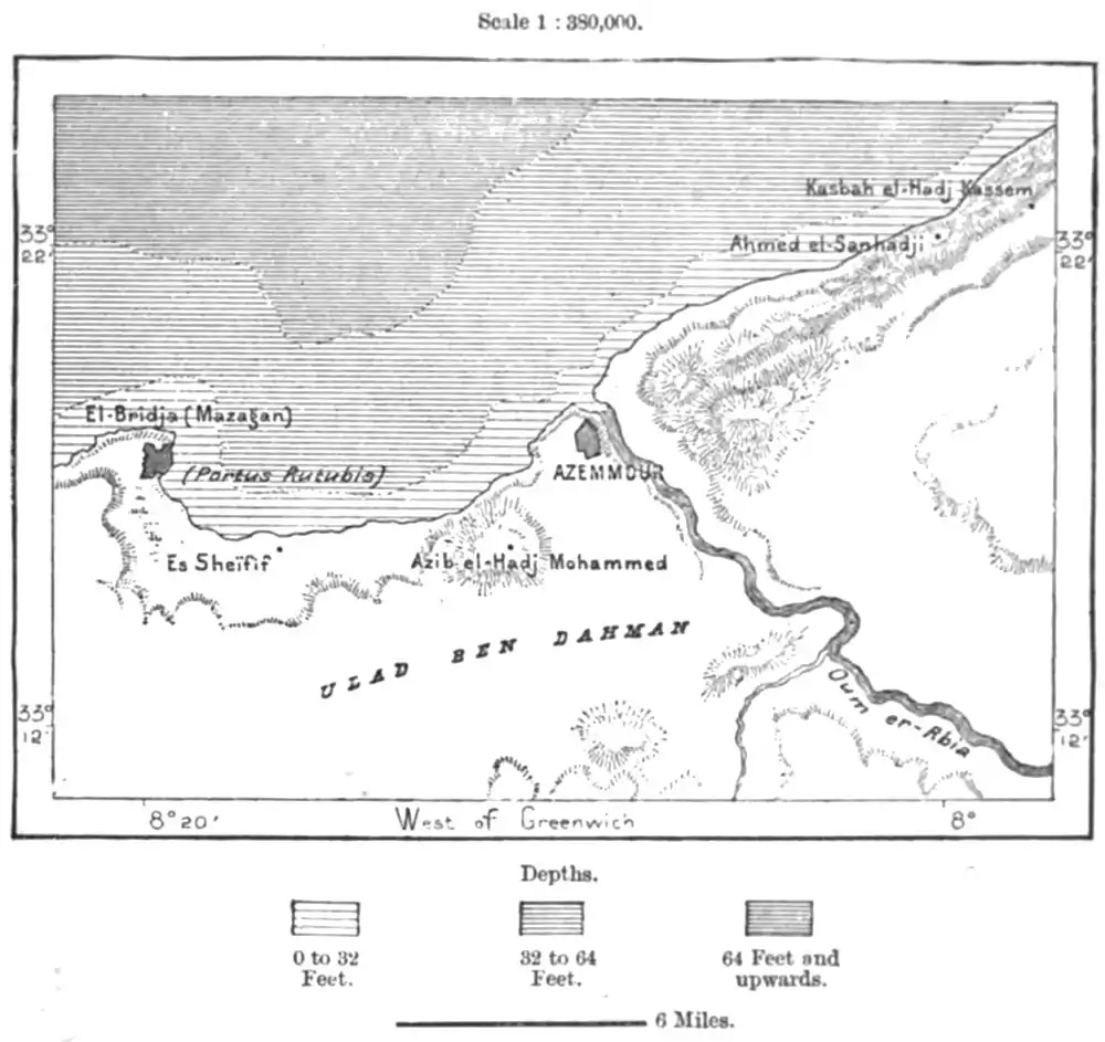 South-east of Mazagan two breaks in the coastline, between this town and Cape Cantin, give access to the Wulidiya lagoon, the ancient port of El-Ghaïb. According to Tissot, it would be easy to restore this harbour and make it the best on the coast. As in the time of Scylax, Cape Cantin, the Solis Mons of the ancients, is one of the