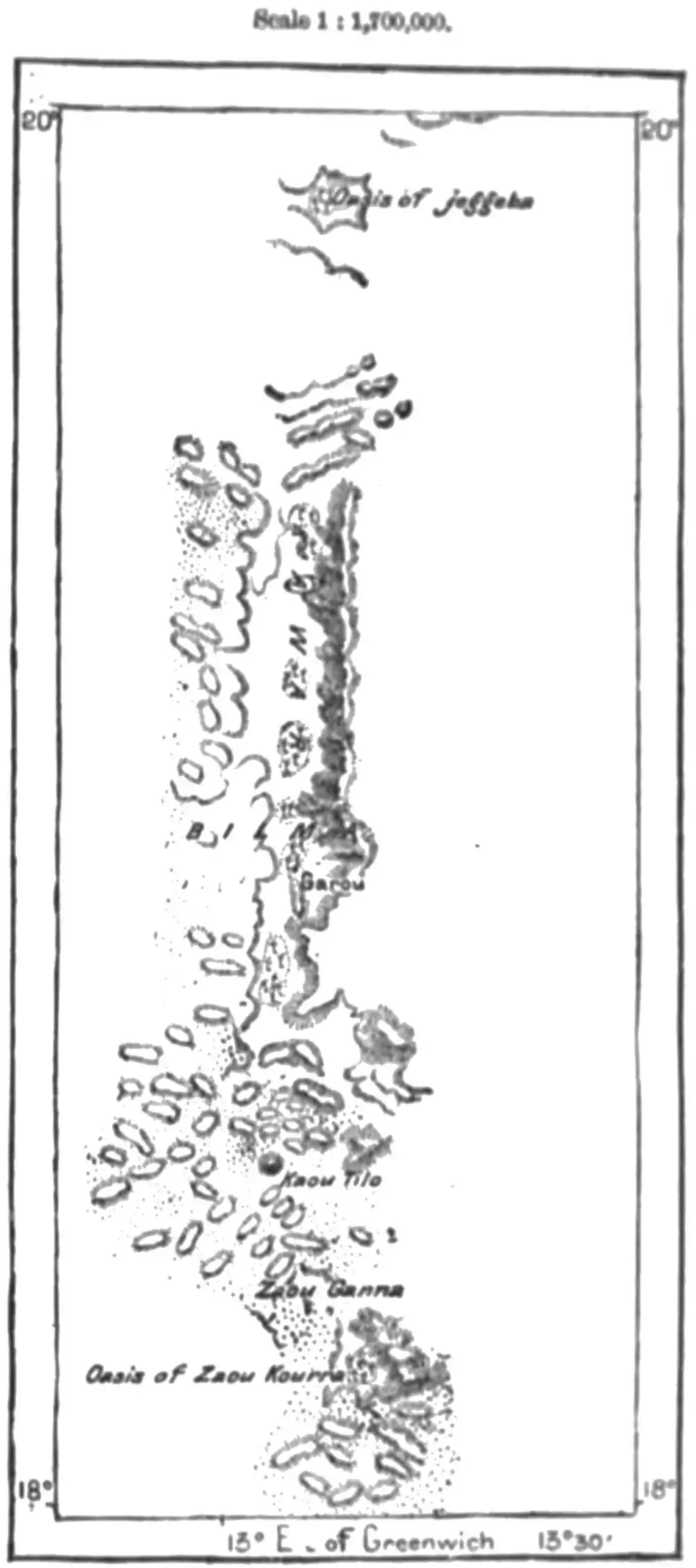 The beauty of the Teda type has not been impaired by crossings. In the Kawar oasis the women are distinguished by the same regular features and well-balanced forms as their Tibesti sisters; but they have over and above a graceful carriage, soft expression, and charming smile. The feasts are more cheerfully celebrated, the processions und cavalcades more sumptuous than in the eastern highlands, Nor are the customs the same along this great caravan route as in the more sterile and secluded Native hills of the race. The dardai, who more frequently takes the title of mai, or "king," exercises real authority over his subjects, But he finds a rival power in the person of the mkaddem of the Senûsiyas, who resides at the convent of Shimedru, not far from the capital.