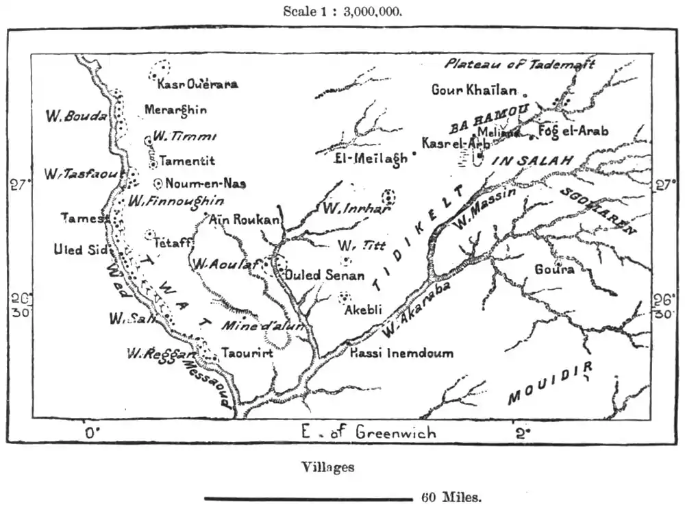 In this district the most important palm groves are those of Insalah (the Ain-Salah, or "Fountain of Peace" of the Arabs), which lie in the northern part of the Tidikelt oasis. Here several villages follow from north to south along the