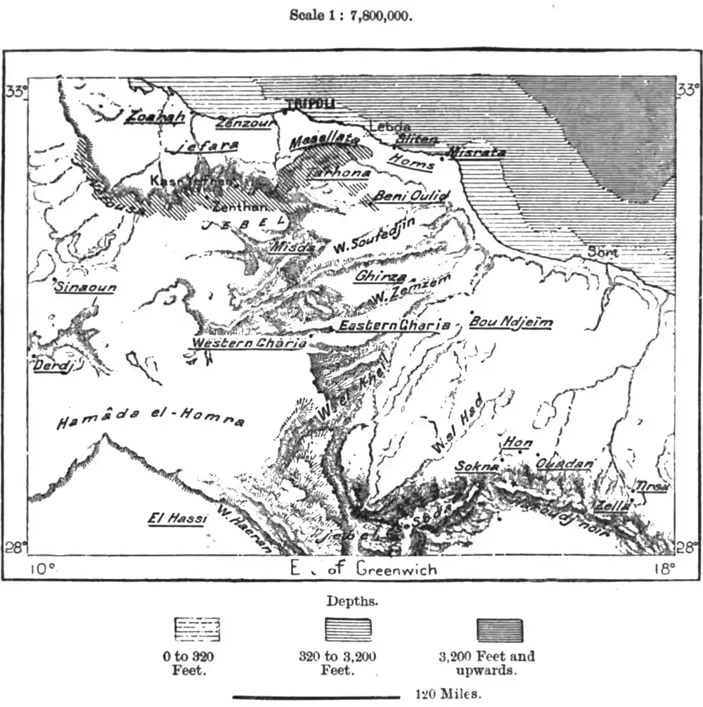 also met a few date-palms with bifurcating stem, like that of the dum-palm, a plant also represented in the flora of South Tripolitana. The finest dates are said to be those yielded by the plantations of Gharia, in the upland valley of the Wady Zemzem, although these are still inferior to those of the Suf district in Algeria and of the Wady Draa in the south of Marocco. The number of dates cultivated whole of Tripolitana may be estimated at about two millions. Whether in the oases of the Jebel-es-Soda or of the Red Hamâda, or on the steppes skirting the Mediterranean seaboard, the plantations are everywhere formed of trees set close together, the groves thus producing at a distance the effect of verdant islands.