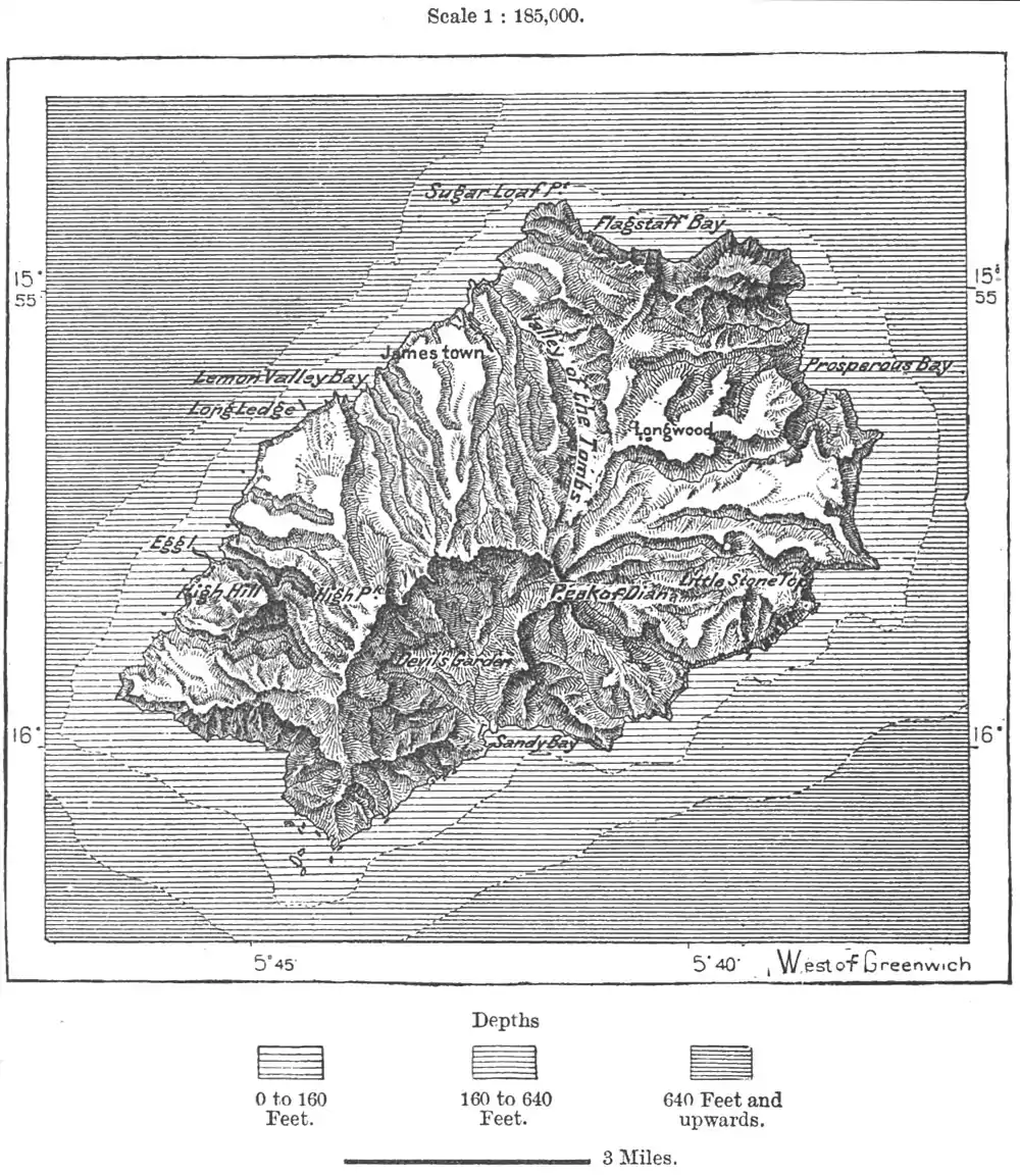 hills. Throughout the year the days when the sky is overcast are twice as numerous as the cloudless days, and the mean difference between the winter colds and summer heats scarcely exceeds 30° F., the glass generally ranging from 53° F. to 83° F. For a hundred and forty days the annual rainfall reaches 27 inches in Jamestown, where the atmosphere is relatively dry; but at Longwood, in the hills, it exceeds 48 inches. Heavy downpours occur chiefly in March and April, that is, at the beginning of the Austral winter; but thunderstorms are
