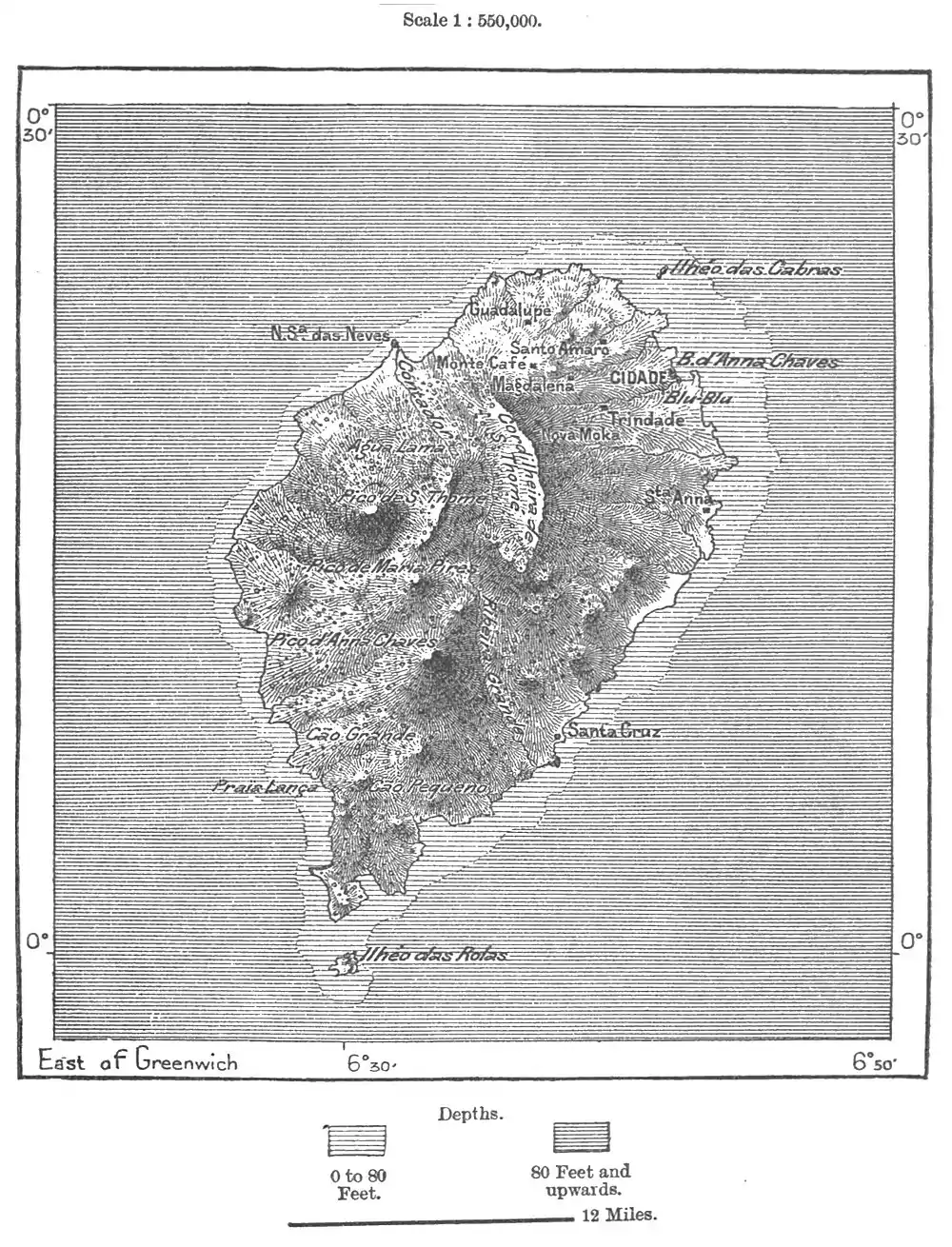 January 1st of that year. It is the smallest of the group, with a superficial area of scarcely 7 square miles. This mass of fissured lavas rises in the central cone of Pico do Fogo to a height of 3,250 feet. Encircling the peak are some forest-clad lateral cones, and a small crater near the summit is flooded by a lake in whose