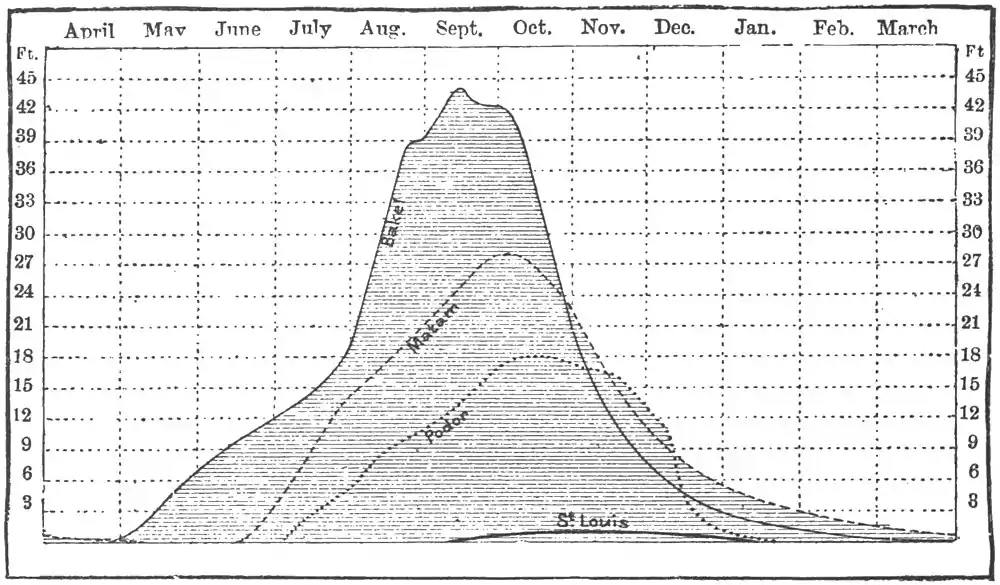 force of the current stems the tidal stream, so that the water is quite fresh at Saint Louis, and even penetrates into the sea, where it may be distinguished by its yellowish colour amid the liquid blue of the surrounding ocean. At this season the discharge is certainly several thousand cubic yards per second, for the stream not only fills the broad and deep fluvial bed, but also overflows both banks, flooding numerous lateral lagoons, or "false rivers," which mark the course of former channels. The inundations even attain an exceptional development about every four years, when in its lower course the river assumes the aspect of a great inland sea from 12 to 15 miles wide.