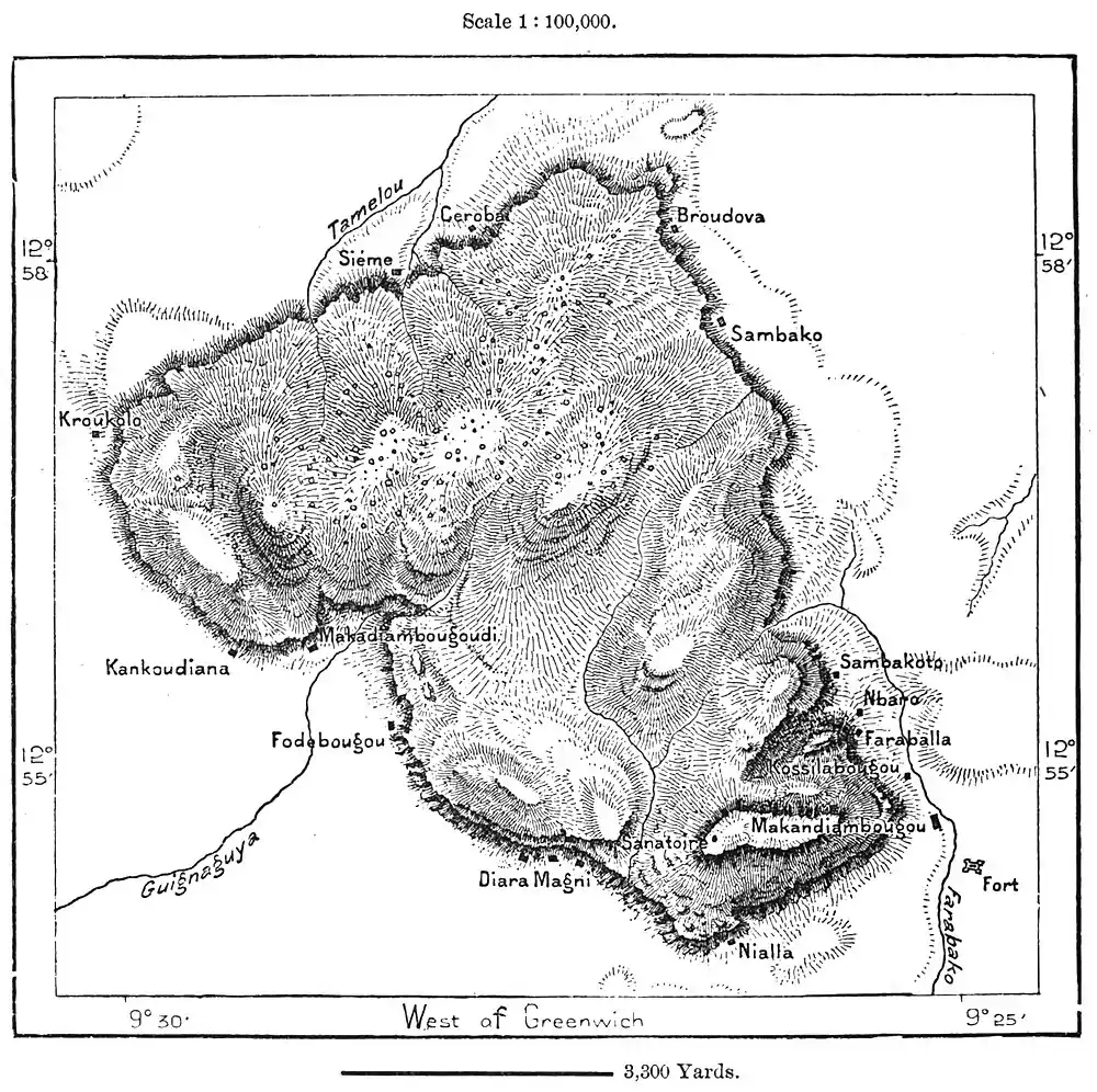 Timbo, capital of Futa-Jallon, lies 2,560 feet above sea-level in a hilly district encircled by the semicircular valley of the Bafing and traversed from south to north by one of its head streams. This royal capital is not a large place, consisting only of some groups of cone-shaped huts half buried in verdure at the foot of two neighbouring hills. The descendants of the original founders, who came from Massina less than two centuries ago, have alone the right to reside in Timbo, where,