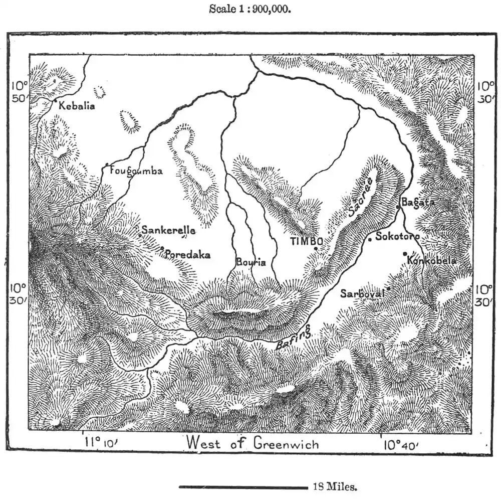 Fugumba, the holy city of Futa-Jallon, a group of a thousand huts some 30 miles north-west of Timbo in the valley of the Téné, which flows either to the Bafing or to the Falémé, is so embowered in trees that none of the surrounding heights command a complete view of the place. Here the conquering Fulahs erected the first mosque in this region, a lofty conic structure, in which each new sovereign