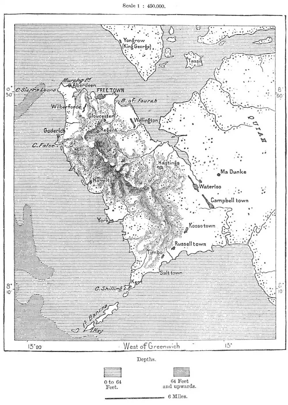 bristles with capes and headlands. Of these promontories the largest is that specially known as Sierra-Leone, at the northern extremity of which stands the capital of the British possessions. During spring tide and heavy rains, this