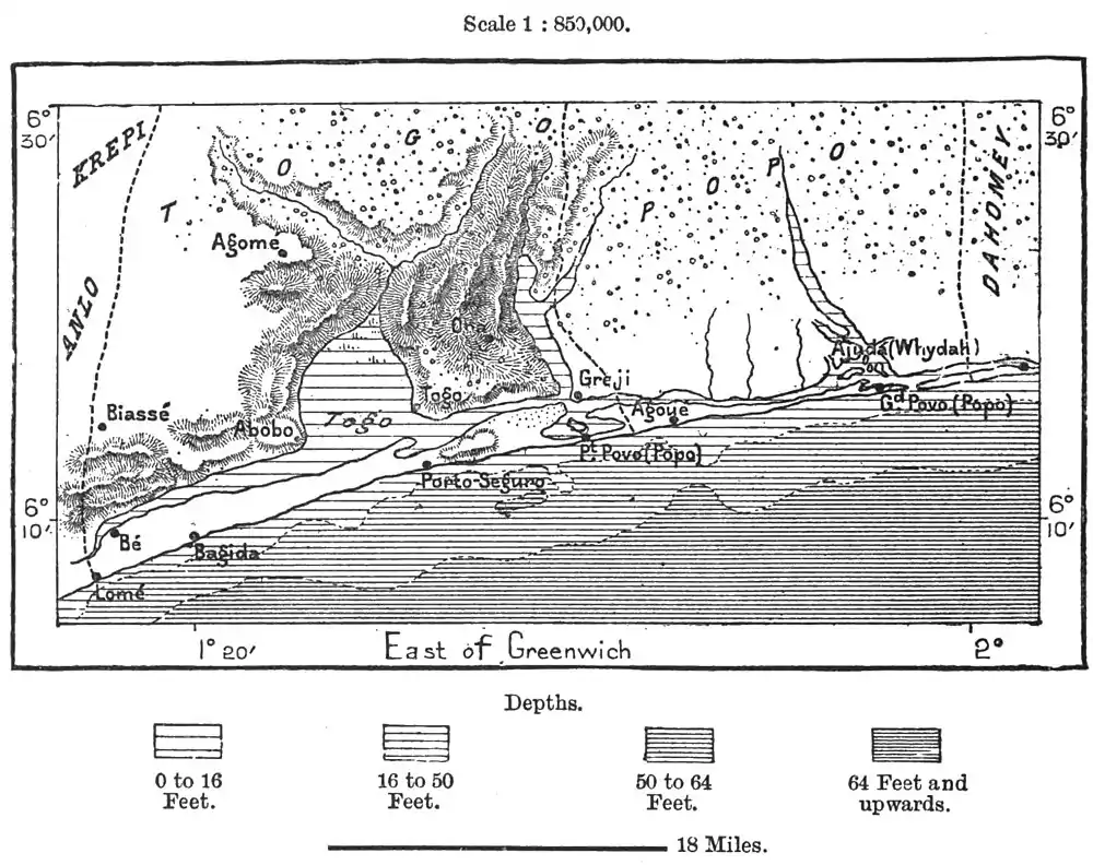 The kingdom of Little Popo, east of Togo, was till lately a French protectorate, but has recently been transferred to Germany in exchange for some places on the South Senegambian coast. Povo, as it is called by the Germans, consists, like Togo, of two distinct zones, the seaboard on which are situated the trading places, and the almost unknown but much better cultivated region beyond the lagoons.