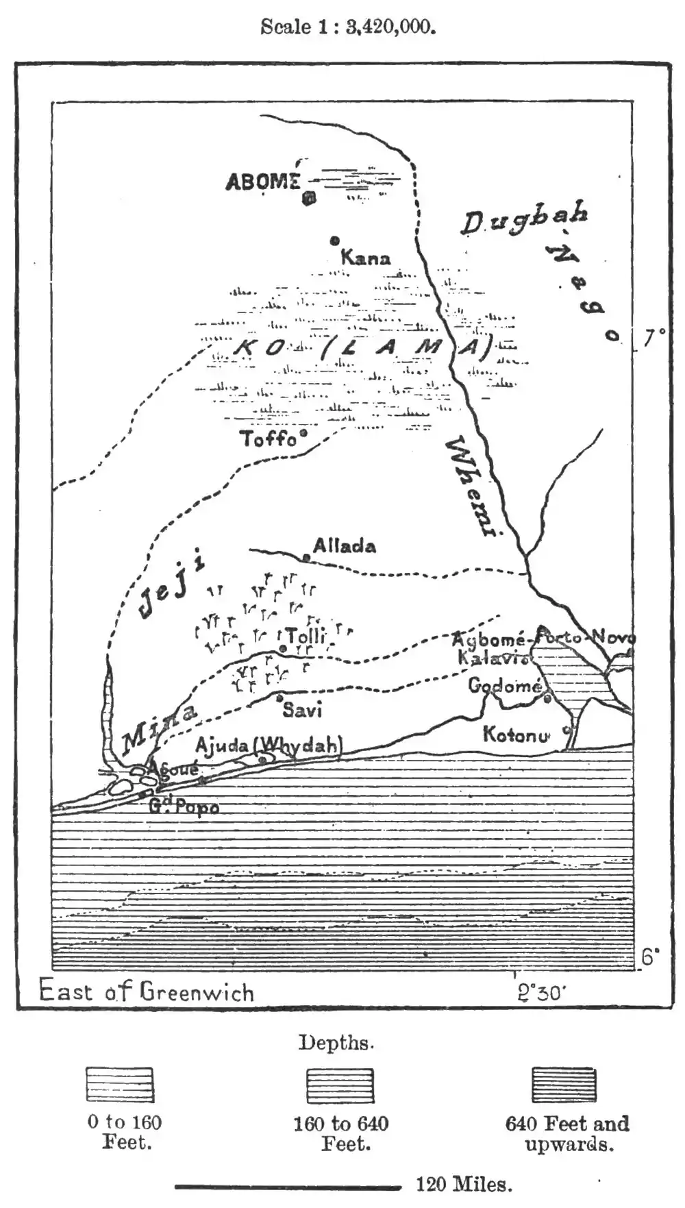 The natural limit which formerly separated the states of Allada and Dahomey is the extensive swamp of Ko, or Lama, easily traversed in the fine season, but almost impassable during the rains. In 1784, the most difficult points were bridged and the road partly raised, but soon again subsided. North of Ko begins the true continental coastline, and here, on a terrace over 1,000 feet above the sea-level, but easily accessible from the south, stands Abomey (Agbomey), capital of Dahomey, a "City within an enclosure," as the name signifies, with monumental gates, deep ditches, and a thick-set wall of thorny trees. Abomey covers an extensive area, but most of the enclosed space consists of gardens and ruins, while the aggregate of huts called the palace is alone two miles in circuit. The wall of this residence was formerly stuck all round with human heads or skulls, eloquent witnesses of the royal power. But the Minister of Portugal, the protecting state, no longer tolerates the massacres till recently required by custom, and nothing is now seen except the iron spikes on which once stood the hideous trophies.