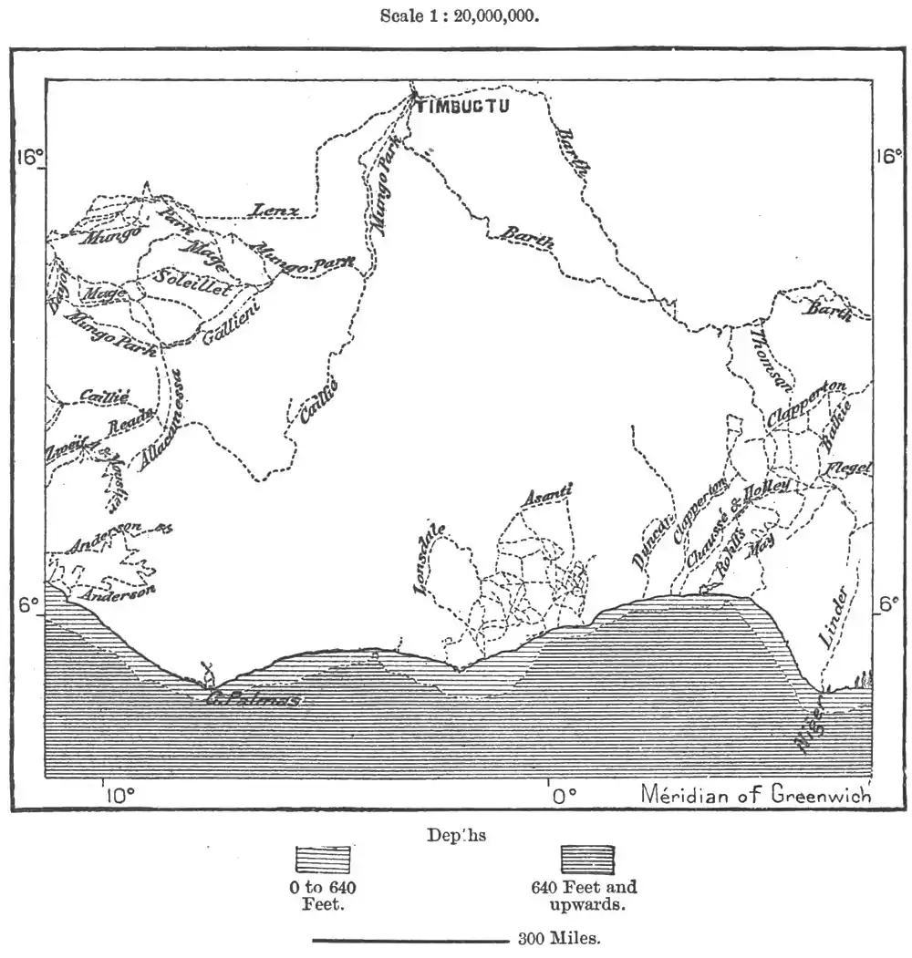 source, and in 1869 Winwood Reade crossed the Joliba itself within 110 miles from its origin. Ten years later, Zweifel and Moustier came within sight of the Tembikundu hill, the fountain-head of the sacred river; but the spirit of the waters, represented by a suspicious high-priest, barred their farther advance. Of the upper course the best known section is naturally that which forms the present boundary of French Sudan for a distance of about 300 miles between Falaba and Sansandig. But even here the side branches and eastern affluents have been traced on the maps only from the reports of native traders. Below Timbuktu the