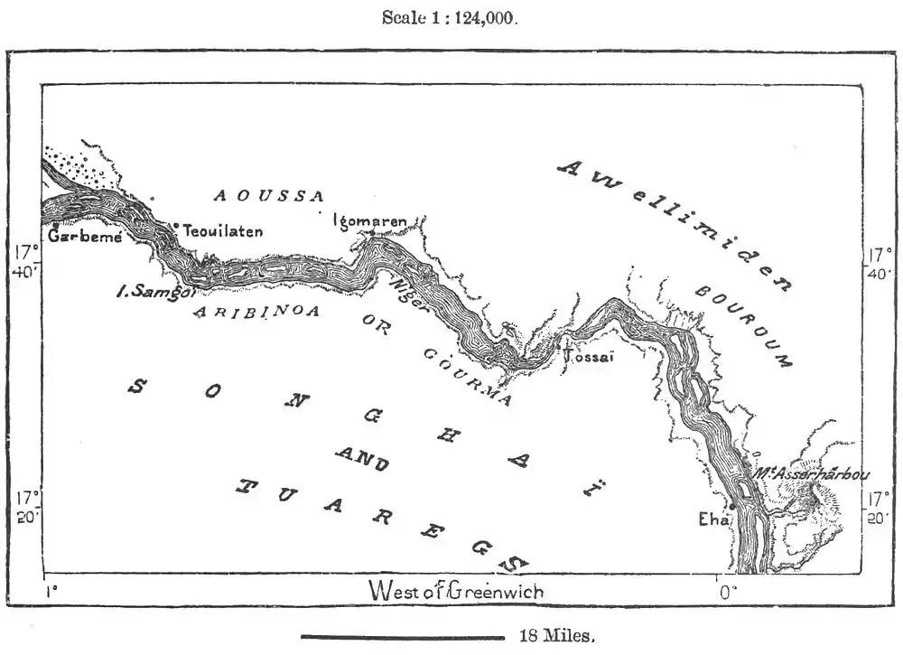 of obelisks, the remains of obstructions not yet entirely removed by the current. Farther on follow other narrows and barriers, especially south of a chain of hills 800 to 1,000 feet high skirting the left bank Here the Niger is joined by the now almost dried-up Wed Tafassasset, which rises on the southern slopes of the Ahaggar hills, and which with its various ramifications probably at one time watered a region as extensive as that of the Joliba itself. The Jallul Bosso valley, in which the whole system converges, is even now never quite waterless, its lower course winding through a district with a yearly rainfall of scarcely less than 20 inches.