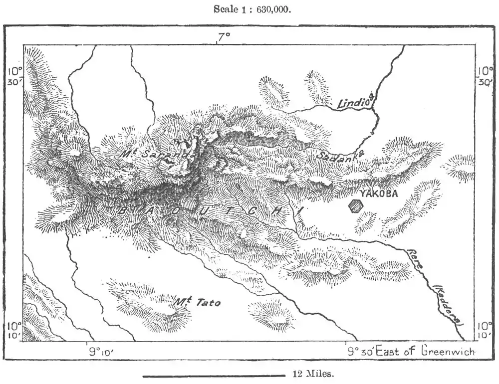 On the north side of the main stream below the Gongola confluence stands Muri (Hamarawa), capital of the Muri vassal state, inhabited chiefly by zealous Fulah Mohammedans. On the opposite side of the Benue lies the city of Zhiru, enclosed on the south by the Adamawa Mountains. Wukari, capital of the Kororofa state, which is separated from Bautchi by the main stream below the Kaddera junction, was visited for the first time by a European (Flegel) in 1883, Like Muri, it lies some distance from the bank of the river, where the neighbouring ports of Tcharo, Shibu, Ibi and Anyashi are now frequently visited by explorers
