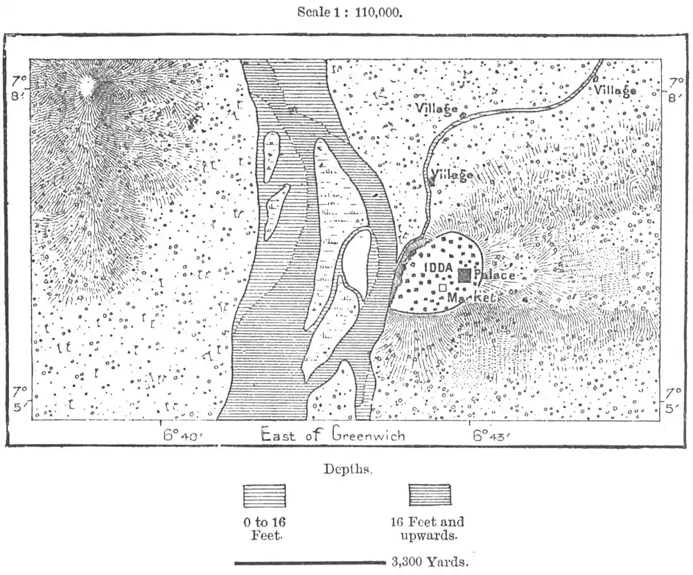 Onitcha, a still larger place than Idda, lies about 2 miles from the left bank on a well-cultivated terrace rising 130 feet above the low-water level. Ona bluff a little higher up on the opposite side stands the town of Assaba (Assabua), where the English have also some factories. Till recently no one could be ennobled in Assaba without offering a human sacrifice to the local genii, and the town contained no less than four hundred of these dignitaries, Thanks to its position. about half-way between the Niger-Benue confluence and the mouth of the Nun, Onitcha hag become the most important depôt along the whole course of the Niger,