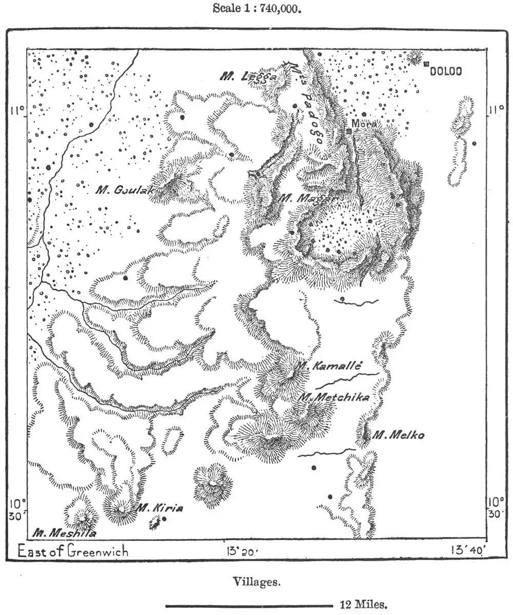 The Munio hills, which eae like a promontory into the steppe bordering on the desert, have also some important places, such as Guré, Vushek, and farther south Buné and Suleri, near which is a natron lake, and another with two basins,