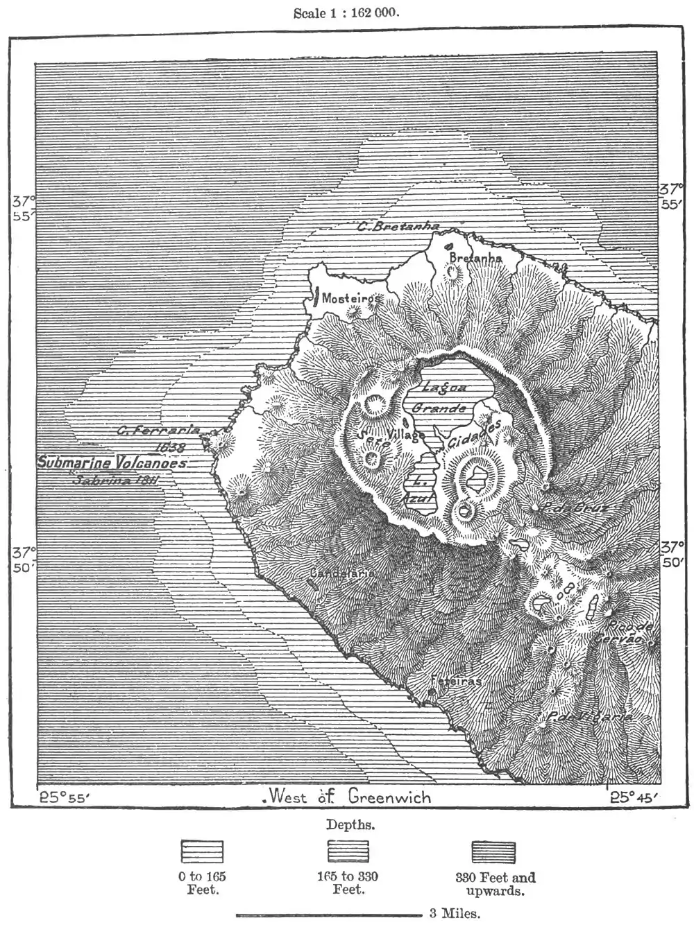 needle, and take the name of olhos, or "eyes;" but the most copious spring is the caldeira, or "cauldron," which ejects with a rumbling noise a liquid stream to a height of over three feet above the level of the basin. From the encircling rocks, worn and bleached by the acids, there escape some boiling rivulets, and even in the bed of the main stream hot springs are revealed by the bubbles and vapours