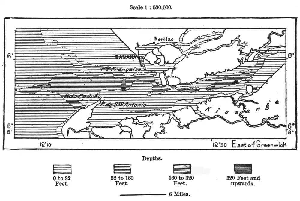 Towards the middle of the estuary, the distance from shore to shore exceeds 10 miles; but as it approaches the sea the current again contracts, the chief branch being less than 4 miles wide, while the waters on both sides ramify into a thousand tidal channels. At the mouth the distance from point to point is nearly 7 miles, and in some places no less than 1,000 feet deep. Here the Banana approach, nearly 20 feet deep at low water, runs athwart the stream in the direction from north-east to south-west in continuation of two sandy spits, on one side the peninsula of Banana, on the other Shark Point, or Cape Santo-Antonio. On most modern maps the most advanced headland south-west of this point is wrongly marked as the famous Cape Padrão, where Diego Cam, discoverer of the Congo, erected a marble column in 1485 to indicate the possession of this territory by Portugal. Cape Padrão is in fact identical with Shark Point, although the