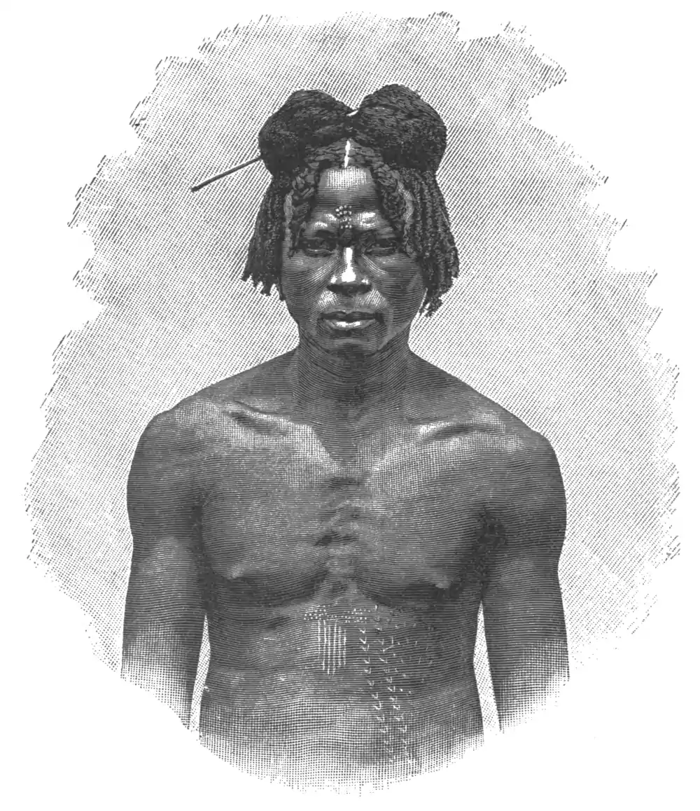 The Zandehs are round-headed, with straight nose, wide nostrils, full cheeks and lips, round and almost feminine features, an effect which is heightened by their peculiar style of head-dress. Their kinky hair is remarkable for its great length, some wearing tresses which reach down to the waist, while many are furnished with a dense beard much longer than that of any other Negro or negroid peoples. The female head-dress is much more simple than that of the men, who spend whole