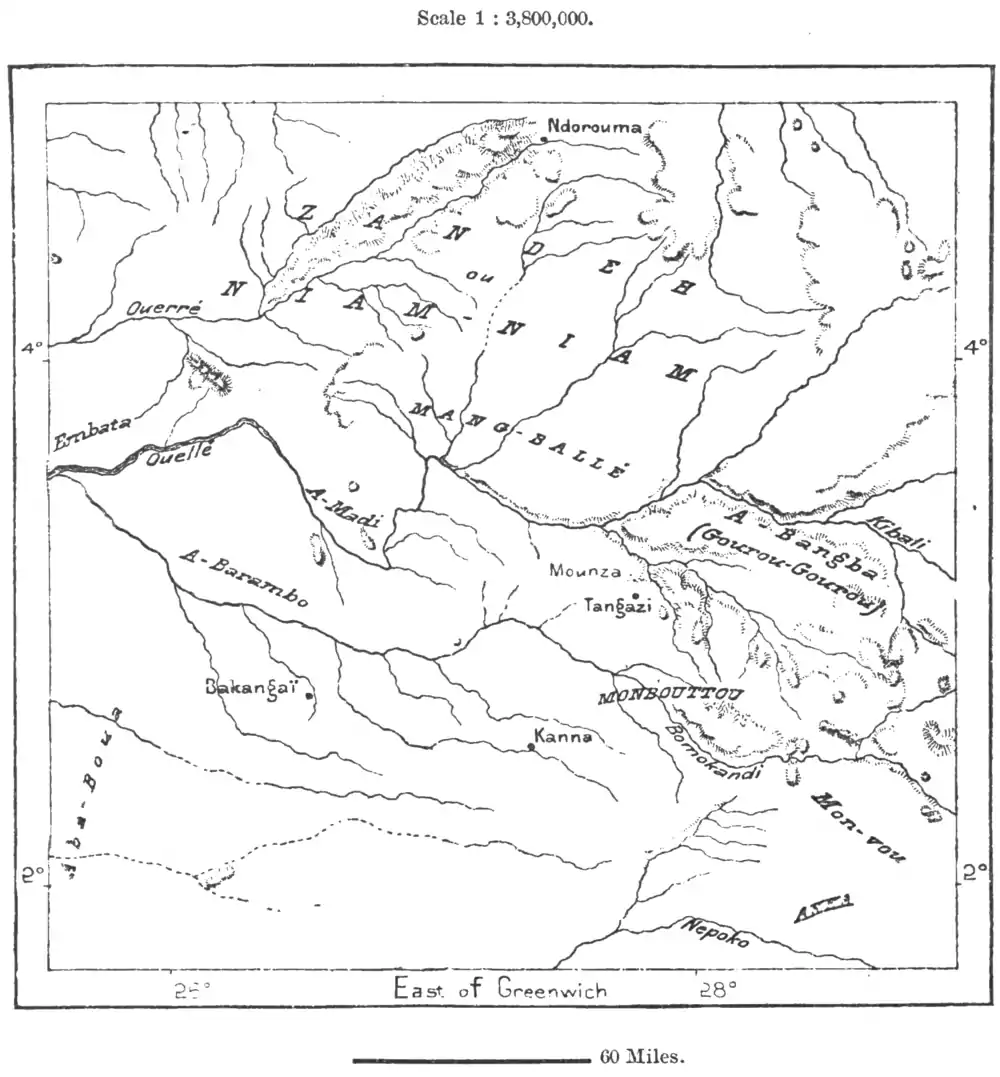 rectangle, as the sign of their nationality. The skin of an animal encircles their waist, and the chiefs adorn their heads with a leopard's fur, while all file the incisors to a point. Despite the soft rounded form of the features and bust, and the feminine elegance of their coiffure, the Zandehs are distinguished amongst all Africans by their noble carriage. The trunk may perhaps be somewhat long compared to the lower extremities, but they are none the less noted for their marvellous agility, using their offensive weapons, such as the spear and dart, with dangerous dexterity.