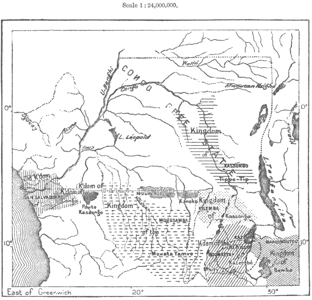North of the territory chosen as the site of the royal residence, the domain of the Muata Yamvo extends to no great distance, the banks of the Lu-Lua and its tributaries being occupied in this direction by the savage Ka-Wanda people, who have hitherto valiantly resisted all attempts at conquest. Their bowmen are said to dip their arrowheads in a very active poison, of which they alone have the secret, and with which they imbue the thorny bushes along the tracts in order to destroy the enemy penetrating into their territory. In any case, no European explorer has yet succeeded in making his way into the Ka-Wanda country.