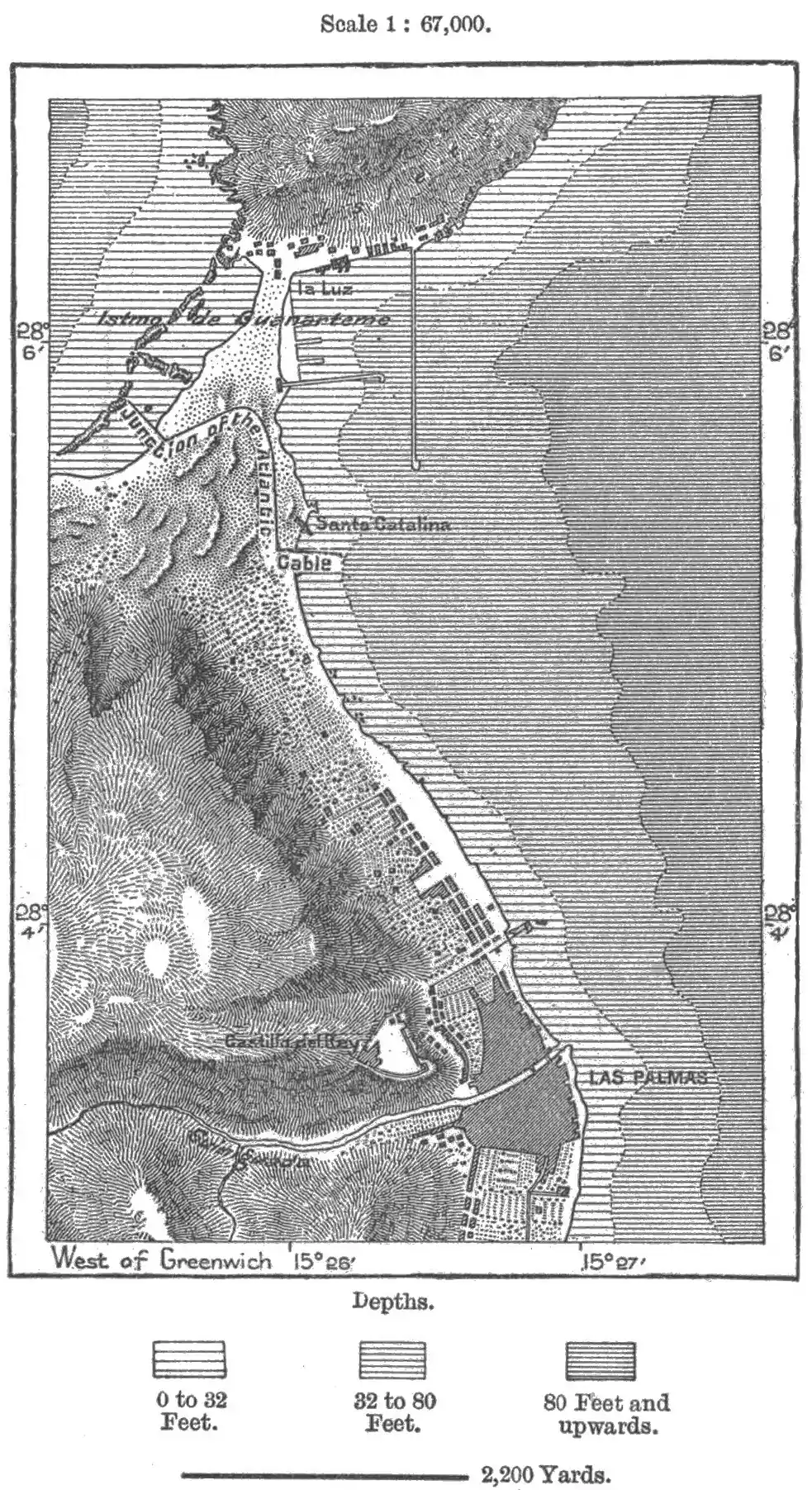 Teneriffe (Tenerife, Tonerfiz, or the "White Mountain," as explained by some etymologists), is the largest island in the archipelago. Here is also the loftiest volcano, the far-famed Peak of Teyde, which has at times been seen to vomit from above the clouds fiery lava-streams down its steep flanks seawards. Few other oceanic beacons can compare with this 2 majestic cone standing out West of Greenwich _15°aet in white and light blue tints against the deeper azure ground of the firmament. But although visible at times from distances of 120 and even 180 miles, it is too often wrapped in a vapour mantle, concealing it altogether from the eager gaze of mariners.