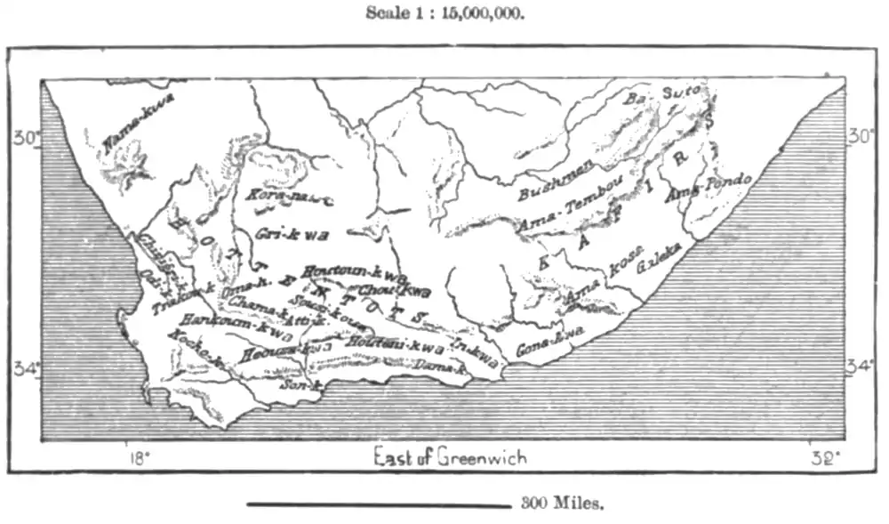 telligible jargon. In the current language of the colony, this appellation has been further reduced to the final syllable, "Tots." They have themselves no general name for the whole race; but the term Khoïn ("Men"), which occurs in several of the tribal denominations, has been extended to all of them collectively, and the Hottentots now commonly call themselves, or are called by scientific writers, Khoï-khoïn, that is, "Men of men," or "men" in a preeminent sense.