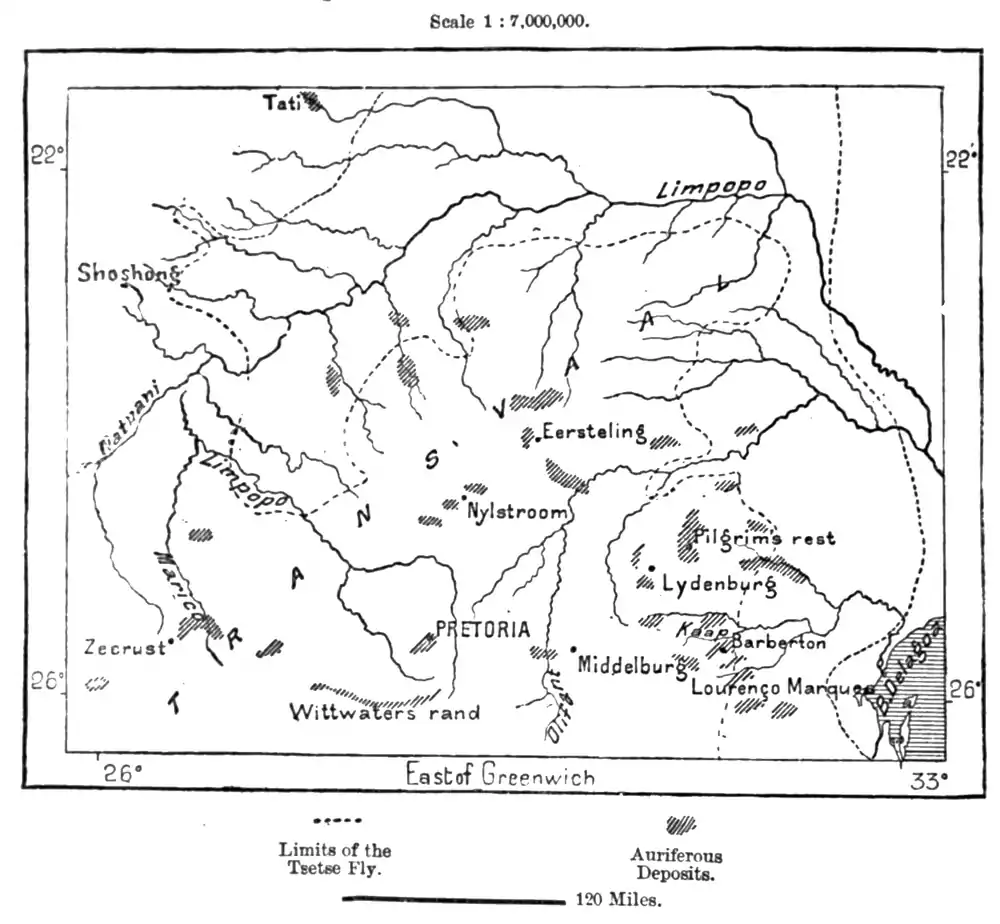 through the Shasha reaches the Limpopo above its great bend towards the southeast. Four years afterwards Button reported the existence of another auriferous district within the limits of the republic itself, near Eersteling, among the Devonian hills of Makapana, situated about 120 miles to the north-east of Pretoria. In 1873 further discoveries were made in the Lydenburg uplands, which form the northern termination of the Drakenberg border range, Again in 1885 rich deposits were brought to light in the eastern terraces intersected by the affluents of the Manissa, and within the Swazi territory. Lastly, these discoveries