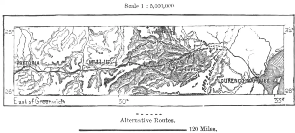 This traveller speaks in depressing terms of the extremely unhealthy climate of Lourenço Marques, described as a perfect hotbed of fever, and so deadly that even horses cannot live there. A station of the Eastern Telegraph Company has been established at Lourenço Marques. But one after another the unfortunate officials in charge of it sooner or later fall victims to the climate. "Now they are trying the experiment of sleeping on board a vessel anchored in the harbour, until they can build a station up on the hill."[2]