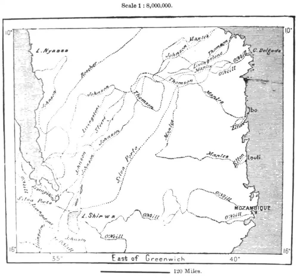 Tho mountain system of the interior is connected westward with the Shire uplands and the ranges skirting the east side of Lake Nyassa. West of Mozambique