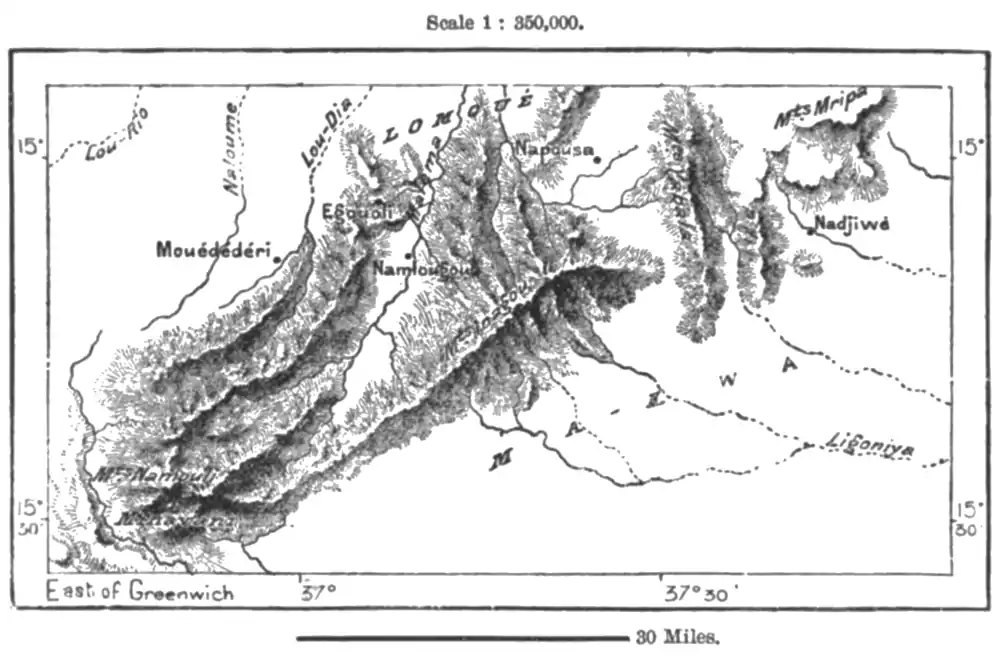 West of the Namuli Mountains, the uplands have been partly denuded by the erosive action of running waters. Nevertheless here also occur some groups of lofty hills, such as the Milanji Mountains, which rise to the south-east of Blantyre and to the south of the Lake Shirwa depression. In the southern part of this region the extensive plains extending in the direction of the Zambese are dotted over with isolated eminences, such es Mounts Shiperoni and Kanga, which are visible for a great distance round about. In the northern districts the heights rise but little above the level of the plateau, or from 350 to about 1,200 or 1,300 feet,