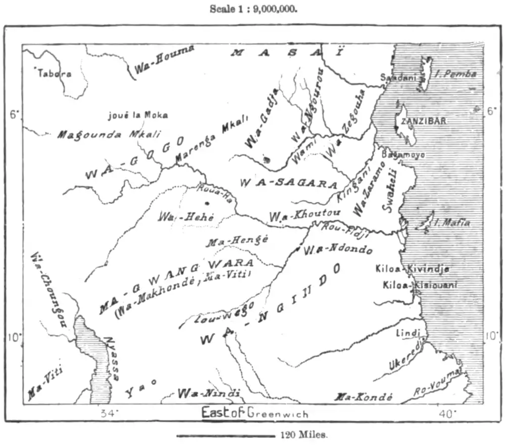 who dwell farther west in tho hilly region about the headstreams of the Kingani, are closely related to, although fur less civilised than, the Wazaramos. They wear nothing but scanty bark clothes, and their habitations are rather dens of wild beasts than human abodes. In their country trials for witchcraft, followed by the inevitable punishment of the stake, are still terribly frequent. Much more civilized are their Wazeguha (Wa-Zeguha, Wa-Zegura) neighbours, who with-the kindred Wangurus (Wu-Nguru), inhabit the unproductive plains on the north side of the mountains traversed by the Lower Wami River. Nearly all these tribes have been converted to the Mohammedan religion through the influence of the contiguous Swaheli and Arab communities; the possession of firearms has also made them formidable slave-hunters.