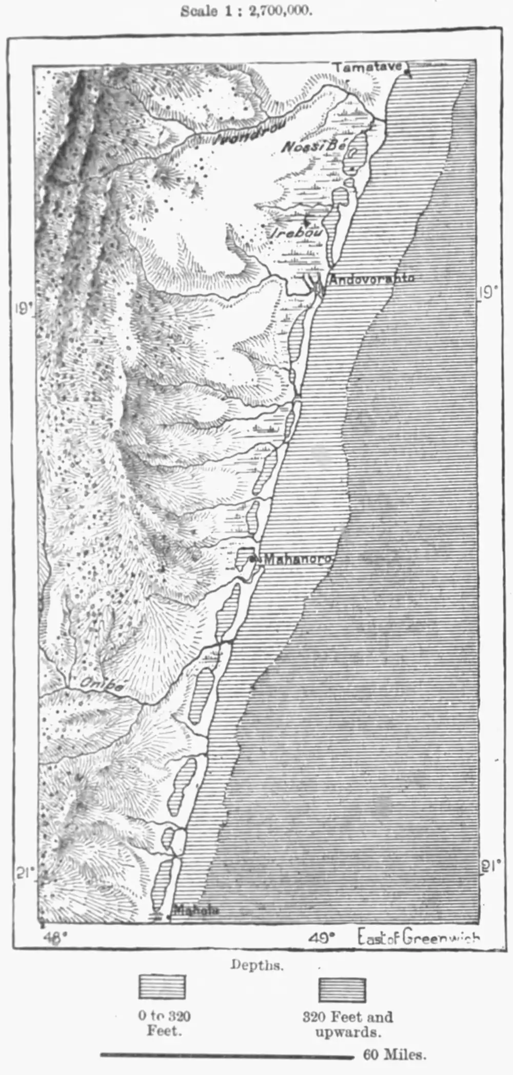 Although the rivers flowing eastwards to the Indian Ocean are closed to navigation above their estuaries, these estuaries themselves, ramifying inland and connected together by lateral channels, present a great extent of navigable waters along the coastlands. A few cuttings made here and there across the sands and coral banks would enable small steamers to ply in smooth water all the way from Ivondru, near Tamatave, to the mouth of the Matitanana — that is to say. for a distance of over 300 miles, reckoning all the windings of the channel. Already, in 1864, Captain Rooke had thoroughly surveyed this water highway, which is here and there obstructed by mud banks and the stakes of the fishermen set all in a row. The ampanalana, or portages, occurring at various points of the future canal, which King Radama I. had already began to construct, have at high water a collective length of about 28 miles. ;