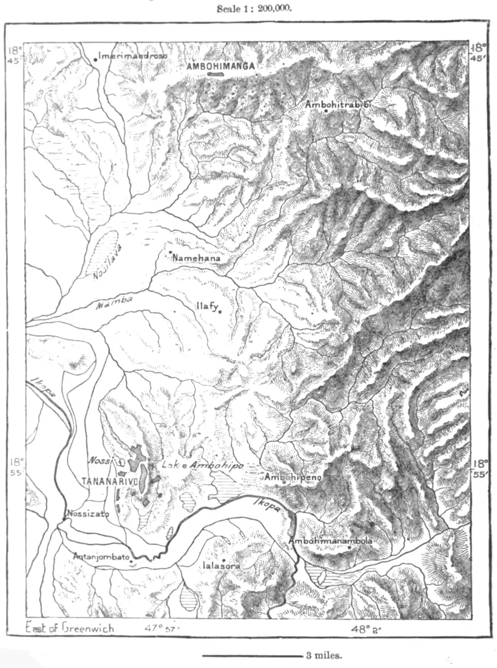 Farther on the boulevard descends into the new town which has sprung up to, the north of the ancient city. Beyond this quarter it stretches away between the rice-fields for some twelve miles across the plain to the town of Ambohimanga, one of the "twelve holy cities," and the most venerated of all. Ambohimanga stands on an isolated gneiss eminence which is shaded by large trees, and at the foot of