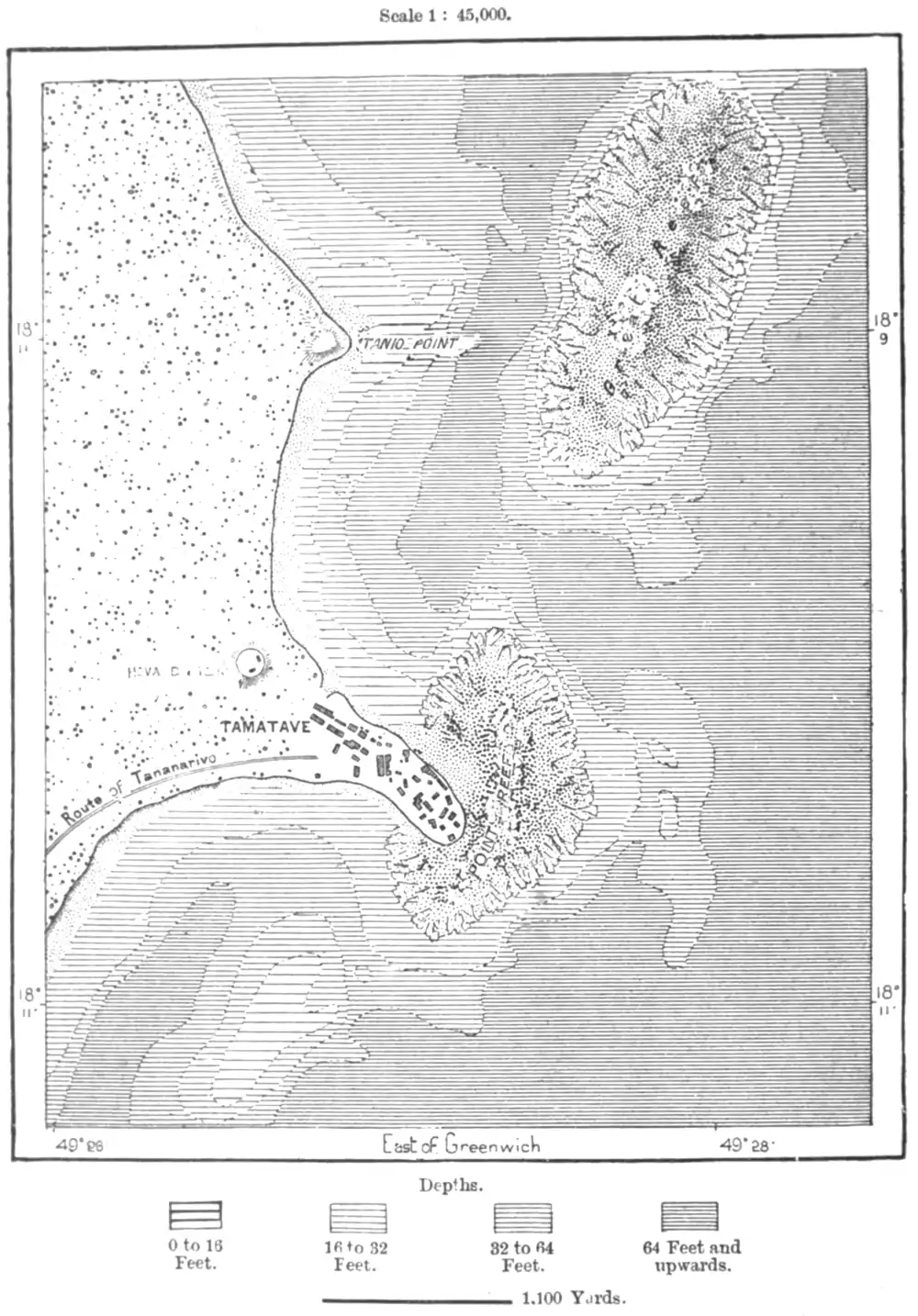 lies nearest to the capital. Hence travellers bound for Tananarivo follow the coast from Tamatave to Andovoranto, and then strike inland from a neighbouring estuary, whence they soon reach the escarpments of the central plateau. This would consequently be an excellent site for a great commercial or naval station, but for the dangerous character of the neighbouring coastlands and the difficult