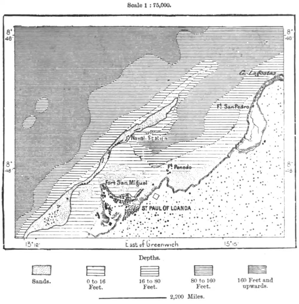 (cypræa moneta), used as currency in the surrounding districts. The Loanda cowries were of greater value as specie than those of Brazil, imported from Bahia, but were still fur inferior to those of the Maldive Archipelago. The insular tongue of land, shaded with cocoanut groves which supply the materials for the manufacture of cordage and wickerwork, has a population of about five thousand, including six hundred fishermen, descended from the ancient Mu-Shi Loanda tribe. Here also the Government has established an arsenal for refitting its fleets.