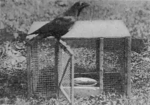 For the following trial I had changed the box so that the door did not open so easily by striking against it. However, Jim struck it fifteen times and the Young Crow 1 outwitted me again by pure accident in lifting the door up when his claws extended over the edge of the box and caught in the upper