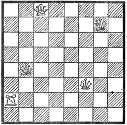 It will be seen that every square of the board is either occupied or attacked. The puzzle is to substitute a bishop for the rook on the same square, and then place the four queens on other squares so that every square shall again be either occupied or attacked.