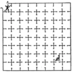 A wicked baron in the good old days imprisoned an innocent maiden in one of the deepest dungeons beneath the castle moat. It will be seen from our illustration that there were sixty-three cells in the dungeon, all connected by open doors, and the maiden was chained in the cell in which she is shown. Now, a valiant knight, who loved the damsel, succeeded in rescuing her from the enemy. Having gained an entrance to the dungeon at the point where he is seen, he succeeded in reaching the maiden after entering every cell once and only once. Take your pencil and try to trace out such a route. When you have succeeded, then try to discover a route in twenty-two straight paths through the cells. It can be done in this number without entering any cell a second time.