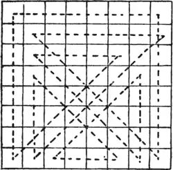 ending at any square marked D—by just turning the board about. Now, this scheme will give you a tour starting from any A, B, C, D, E, F, or H, while no other route that I know can be adapted to more than five different starting-points. There is no Queen's Tour in fourteen moves (remember a tour must be re-entrant) that may start from a G, I, or J. But we can have a non-re-entrant path over the whole board in fourteen moves, starting from any given square. Hence the following puzzle:—