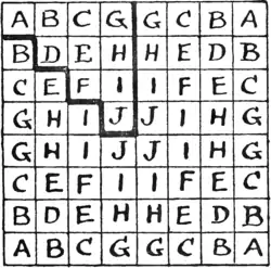 Start from the J in the enclosed part of the lettered diagram and visit every square of the board in fourteen moves, ending wherever you like.