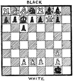One Christmas Eve I was travelling by rail to a little place in one of the southern counties. The compartment was very full, and the passengers were wedged in very tightly. My neighbour in one of the corner seats was closely studying a position set up on one of those little folding chessboards that can be carried conveniently in the pocket, and I could scarcely avoid looking at it myself. Here is the position:—