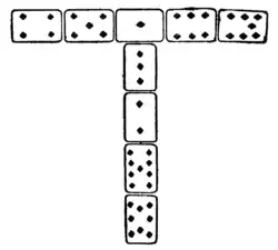 An entertaining little puzzle with cards is to take the nine cards of a suit, from ace to nine inclusive, and arrange them in the form of the letter "T," as shown in the illustration, so that the pips in the horizontal line shall count the same as those in the column. In the example given they add up twenty-three both ways. Now, it is quite easy to get a single correct arrangement. The puzzle is to discover in just how many different ways it may be done. Though the number is high, the solution is not really difficult if we attack the puzzle in the right manner. The reverse way obtained by reflecting the illustration in a mirror we will not count as different, but all other changes in the relative positions of the cards will here count. How many different ways are there?