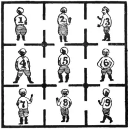 The illustration shows the plan of a prison of nine cells all communicating with one another by doorways. The eight prisoners have their numbers on their backs, and any one of them is allowed to exercise himself in whichever cell may happen to be vacant, subject to the rule that at no time shall two prisoners be in the same cell. The merry monarch in whose dominions the prison was situated offered them special comforts one Christmas Eve if, without breaking that rule, they could so place themselves that their numbers should form a magic square.