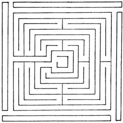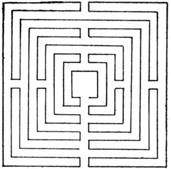 there was one short direct route to the centre, unless, as in Fig. 10 again, the path is the line itself from end to end. This maze was 86 feet square, cut in the turf, and was locally known as the "Mize-maze." It became very indistinct about 1858, and was then recut by the Warden of Winchester, with the aid of a plan possessed by a lady living in the neighbourhood.