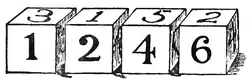 I have a set of four dice, not marked with spots in the ordinary way, but with Arabic figures, as shown in the illustration. Each die, of course, bears the numbers 1 to 6. When put together they will form a good many different numbers. As represented they make the number 1246.