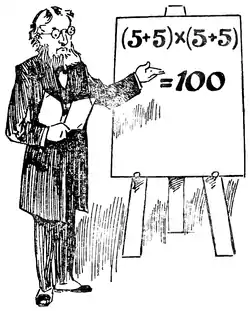 In the illustration Professor Rackbrane is seen demonstrating one of the little posers with which he is accustomed to entertain his class. He believes that by taking his pupils off the beaten tracks he is the better able to secure their attention, and to induce original and ingenious methods of thought. He has, it will be seen, just shown how four 5's may be written with simple arithmetical signs so as to represent 100. Every juvenile reader will see at a glance that his example is quite correct. Now, what he wants you to do is this: Arrange four 7's (neither more nor less) with arithmetical signs so that they shall represent 100. If he had said we were to use four 9's we might at once have written 99 9-9, but the four 7's call for rather more ingenuity. Can you discover the little trick?