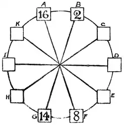 The puzzle is to place a different number in each of the ten squares so that the sum of the squares of any two adjacent numbers shall be equal to the sum of the squares of the two numbers diametrically opposite to them. The four numbers placed, as examples, must stand as they are. The square of 16 is 256, and the square of 2 is 4. Add these together, and the result is 260. Also—the square of 14 is 196, and the square of 8 is 64. These together also make 260. Now, in precisely the same way, B and C should be equal to G and H (the sum will not necessarily be 260), A and K to F and E, H and I to C and D, and so on, with any two adjoining squares in the circle.