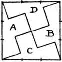 We will now go one step further. I have already said that the ideal solution to a cutting-out puzzle is always that which requires the fewest possible pieces. We have just seen that two crosses of the same size may be cut out of a square in five pieces. The reader who succeeded in solving this perhaps asked himself: "Can it be done in fewer pieces?" This is just the sort of question that the true puzzle lover is always asking, and it is the right attitude for him to adopt. The answer to the question is that the puzzle may be solved in four pieces—the fewest possible. This, then, is a new puzzle. Cut a square into four pieces that will form two Greek crosses of the same size.