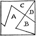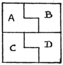 The solution to the puzzle is shown in Figs. 25 and 26. The direction of the cut dividing A and C in the first diagram is very obvious, and the second cut is made at right angles to it. That the four pieces should fit together and form a square will surprise the novice, who will do well to study the puzzle with some care, as it is most instructive.